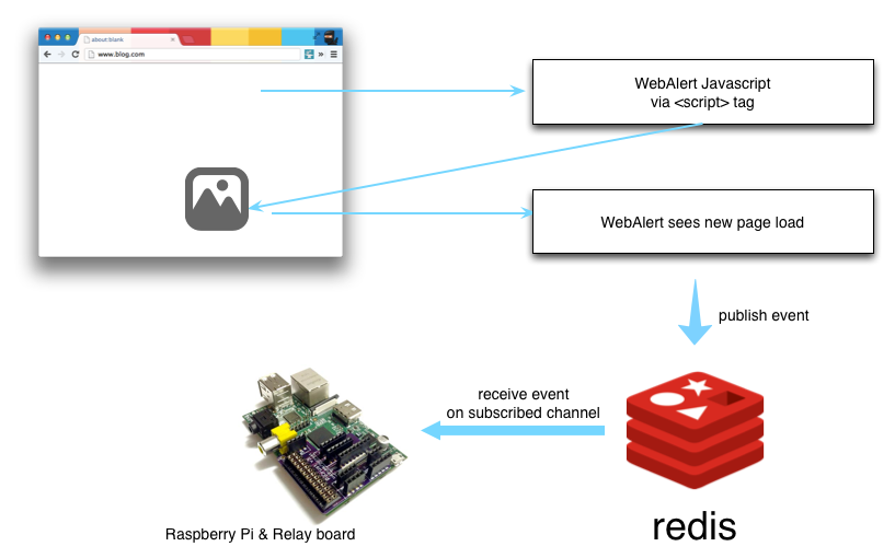 What does webalert do? It’s a simple service hosted on Heroku which serves up a javascript script which adds a 1 pixel, transparent, image to your webpage with a unique URL. When the visitor’s web browser loads that image, the service sees the event and publishes a message to a Redis pubsub queue which the Raspberry Pi listens to. You don’t need to write or install this, you can simply reuse mine.