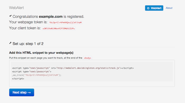 This bit is easy. Visit http://webalert.davidsingleton.org/, register your web page(s) and follow the instructions to add code to your web page.
